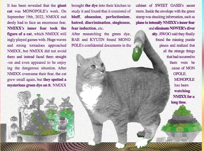 NMIXX, the name of the girl group, wanted to go toward MIXXTOPIA with as many people as possible, but MONOPOLE had been brainwashing them for a very long time. The evil adventurer did not lose time and tried to obstruct the girls' adventure by maximizing their inner fears, who appeared as a giant cat. The six girls faced their fear and enjoyed playing games with the cat, which got smaller after getting dizzy.